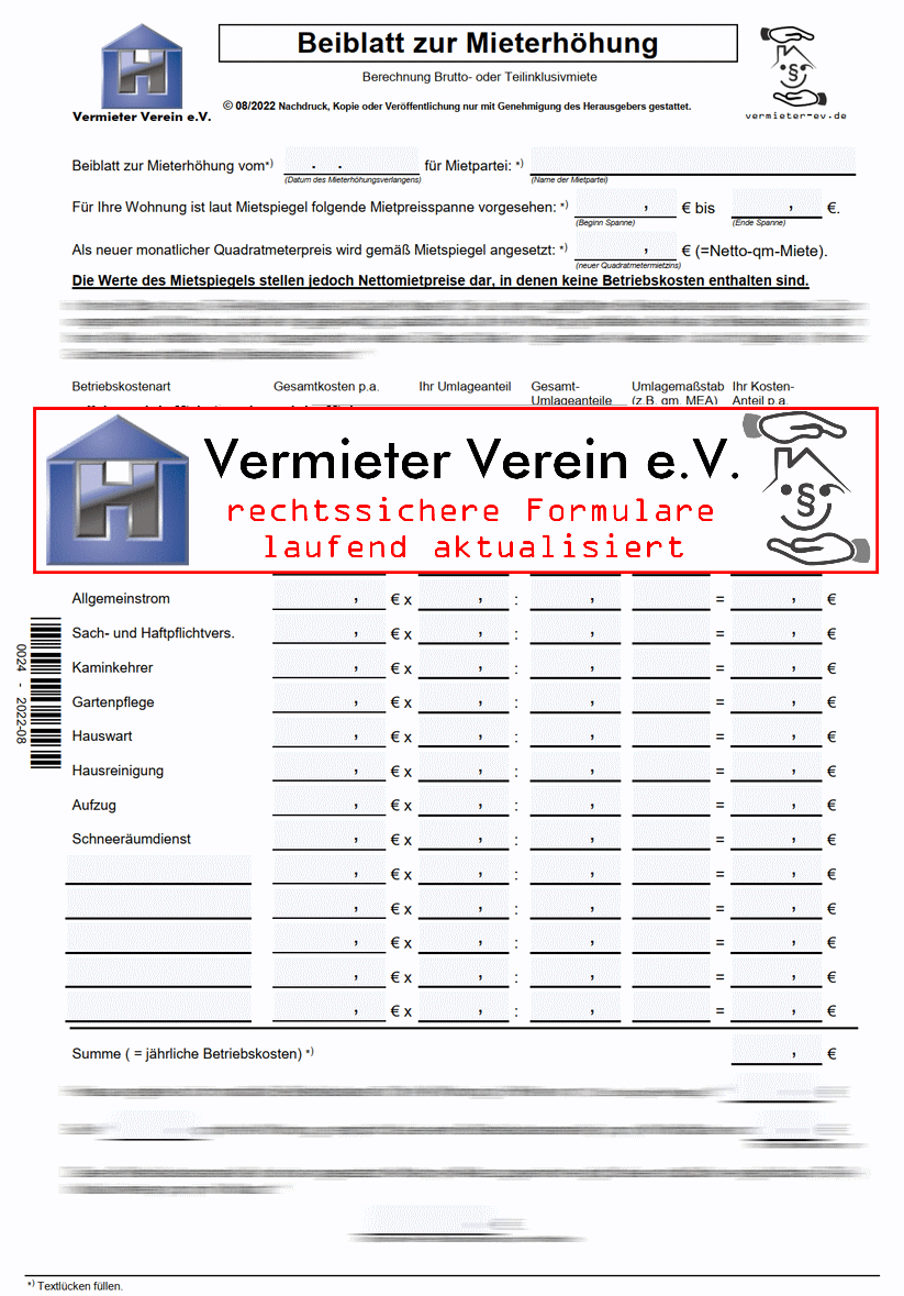 Beiblatt zur Erhöhung einer Teilinklusivmiete