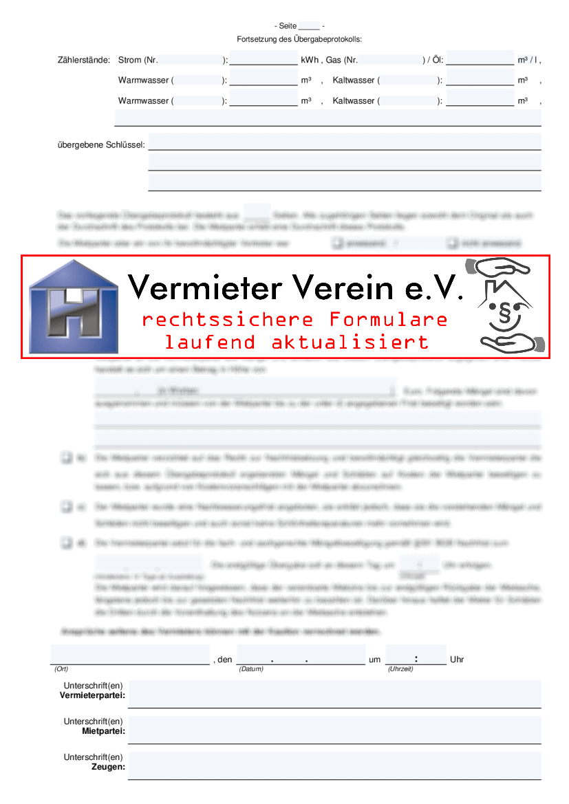 Mehrseitiges, selbstdurchschreibendes Übergabeprotokoll für den Auszug eines Mieters aus einer Wohnung, einem Haus oder einer Gewerbeimmobilie.